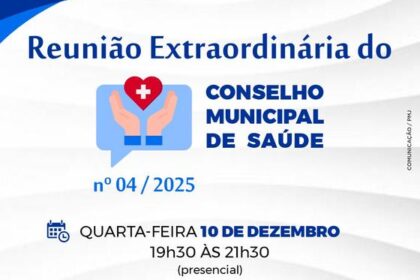 A Prefeitura de Jataí, por meio da Secretaria Municipal de Saúde, e o Conselho Municipal de Saúde (CMS) convidam toda a população para participar da Reunião Extraordinária 04/2025 do Conselho. Detalhe...