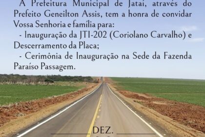 Convite à População A Prefeitura Municipal de Jataí, por meio do Prefeito Geneilton Assis, tem a honra de convidar toda a população para a solenidade de Inauguração do Asfaltamento da JTI-202 (Estrada...