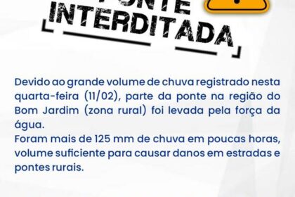 A Prefeitura municipal de Jataí informa que, em decorrência do grande volume pluviométrico registrado nesta quarta feira(11/02), parte da ponte localizada na região do Bom Jardim, na zona rural, foi l...