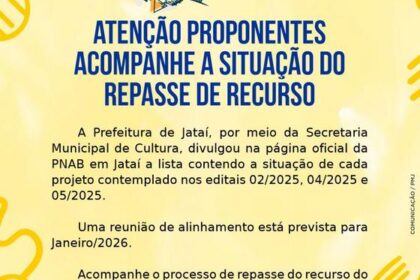 A Secretaria Municipal de Cultura de Jataí, atendendo a diversos questionamentos, informa a todo(a)s o(a)s candidato(a)s classificado(a)s nos editais PNAB que já podem acompanhar o status atualizado d...