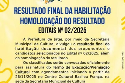 Edital 02/2025 homologa 27 projetos culturais e 10 premiações por trajetória, totalizando aproximadamente R$ 586 mil em investimentos. A Prefeitura Municipal de Jataí, por meio da Secretaria Municipal...