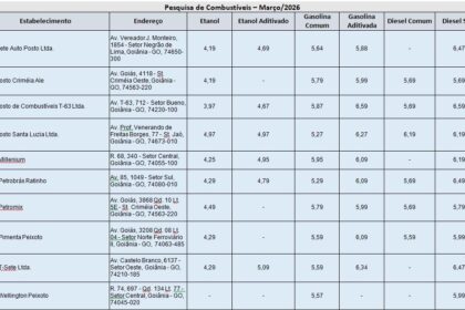 O Procon Goiânia divulga resultados de uma pesquisa comparativa de preços de combustíveis realizada entre os dias 6 e 10 de março em 10 postos do município. O levantamento analisou os valores praticad...