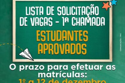 A Prefeitura de Jataí, por meio da Secretaria Municipal de Educação (SME), informa a publicação da Lista de Solicitação de Vagas – 1ª Chamada, contendo os estudantes aprovados para ingresso nas Unidad...