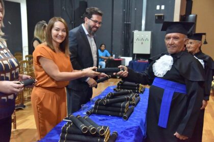 A Prefeitura de Aparecida, em parceria com o Governo de Goiás, abriu as portas do Anfiteatro Municipal Cantor Leandro para a formatura, nesta quarta (05), de 199 alunos do projeto “Alfabetização e Fam...