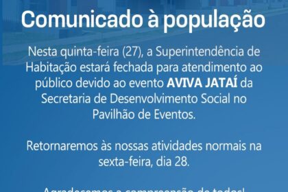 A Prefeitura de Jataí, por meio da Superintendência de Habitação (SUAHB), comunica à população que, nesta quinta-feira, 27 de novembro, a SUAHB estará fechada para atendimento ao público. O fechamento...