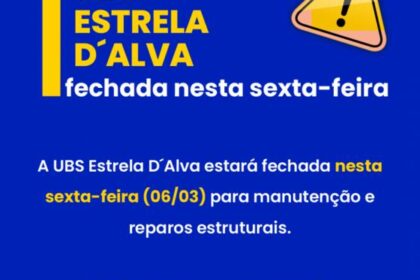 A Prefeitura de Jataí, por meio da Secretaria Municipal de Saúde, informa que a UBS Estrela Dalva estará fechada nesta sexta-feira (06/03) para a realização de manutenção e reparos estruturais na unid...