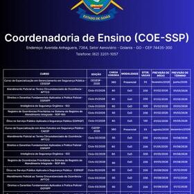A Secretaria de Estado da Segurança Pública (SSP-GO), através da Coordenadoria de Ensino (COE–SSP), divulga o – Exercício 2026. A divulgação tem por finalidade assegurar ampla publicidade às ações edu...