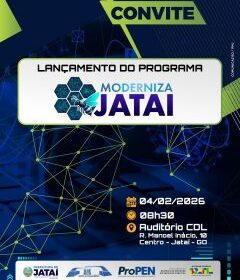 A Prefeitura de Jataí convida toda a comunidade para o lançamento oficial do Programa Moderniza Jataí, que será realizado no dia 4 de Fevereiro. Iniciativa voltada à modernização dos serviços públicos...