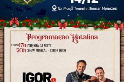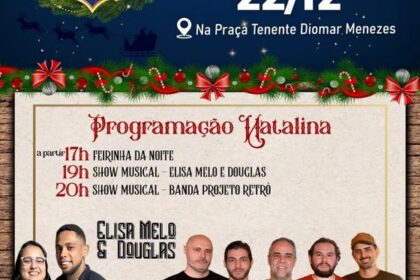 O Natal Encantado Jataí 2025 segue com sua programação cultural e musical nesta segunda feira (22/12), na Praça Tenente Diomar Menezes. As atividades começam às 17h com a Feirinha da Noite. Em seguida...