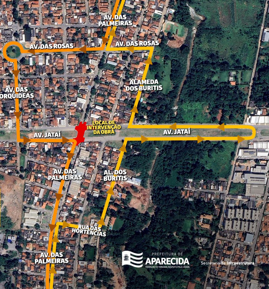 Durante a execução da obra, o tráfego na região será desviado de forma sinalizada. O motorista que vem do setor Santa Luzia com destino ao Jardim dos Buritis deverá acessar a Rua das Avencas e, em seguida, seguir pelas ruas Castanheira, Baunilha e Vitória Régia, retornando à Avenida Jataí após o trecho interditado. Já quem sai do Jardim dos Buritis em direção ao setor Santa Luzia ou à BR-153 deverá utilizar a Avenida Geralda Bufáiçal Pinto, seguir pela Rua das Orquídeas, depois pelas ruas das Rosas e das Oliveiras, até alcançar novamente a Avenida das Palmeiras.