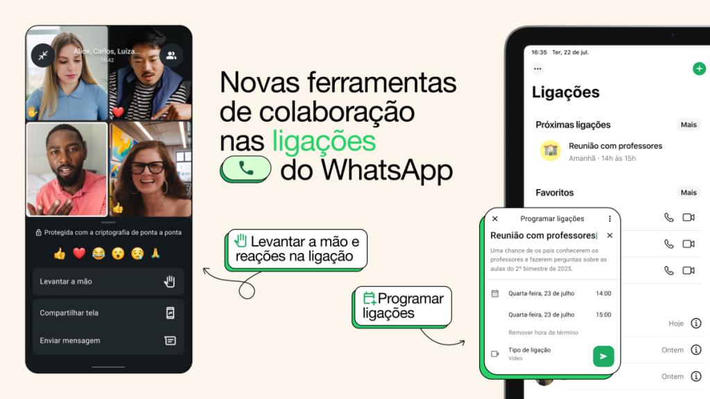 O WhatsApp anunciou nesta quinta-feira (dia 14) duas ferramentas inéditas que estão sendo liberadas de forma gradual para todos os usuários. Agora será possível programar ligações com antecedência e ainda reagir com emojis ou levantar a mão durante uma chamada, facilitando a organização e a interação nos bate-papos por voz ou vídeo.