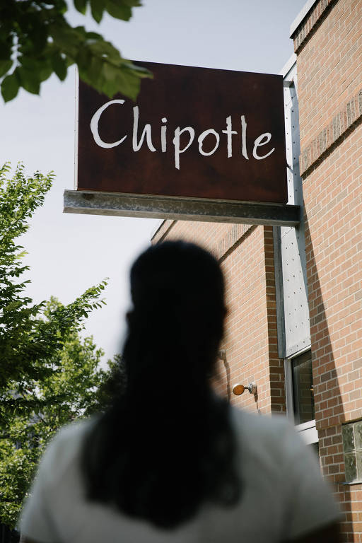 Manasi Mishra, que recentemente se formou na Universidade Purdue com diploma em ciência da computação, em frente a um Chipotle em West Lafayette, Indiana – Madeleine Hordinski – 22.jul.2025/The New York Times