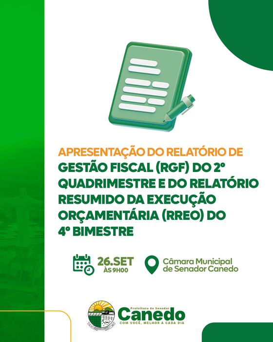 A Prefeitura de Senador Canedo realizará, na próxima sexta-feira (26), uma audiência pública para apresentação do Relatório de Gestão Fiscal (RGF) do 2º quadrimestre e do Relatório Resumido da Execução Orçamentária (RREO) do 4º bimestre. O encontro será realizado no auditório da Câmara Municipal, a partir das 9h.