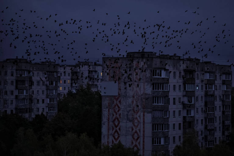 Pássaros voam junto a prédios sem energia em Tchernihiv, que sofreu blecaute após ataque russo – Ian Dobronosov/Reuters