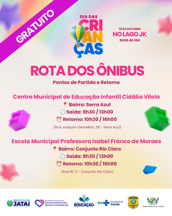 A Prefeitura, por meio da Secretaria, disponibilizará transporte gratuito para que toda a população possa participar da celebração do Dia das Crianças.