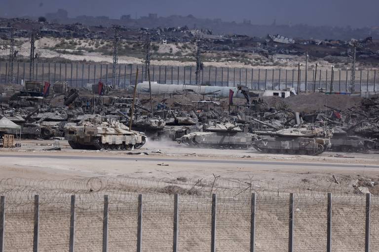 Veículos militares israelenses são vistos na fronteira de Israel com a Faixa de Gaza, após o anúncio do acordo – Jamal Awad – 9.out.25/Xinhua