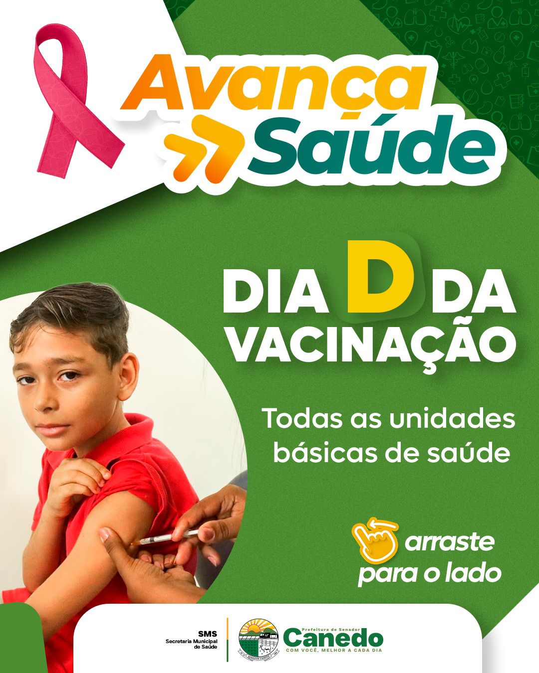 A Prefeitura de Senador Canedo, por meio da Secretaria Municipal de Saúde, promove neste sábado (18) o Avança Saúde e Dia D da Vacinação, uma grande mobilização que vai acontecer em todas as Unidades de Saúde do município, das 8h às 15h.
