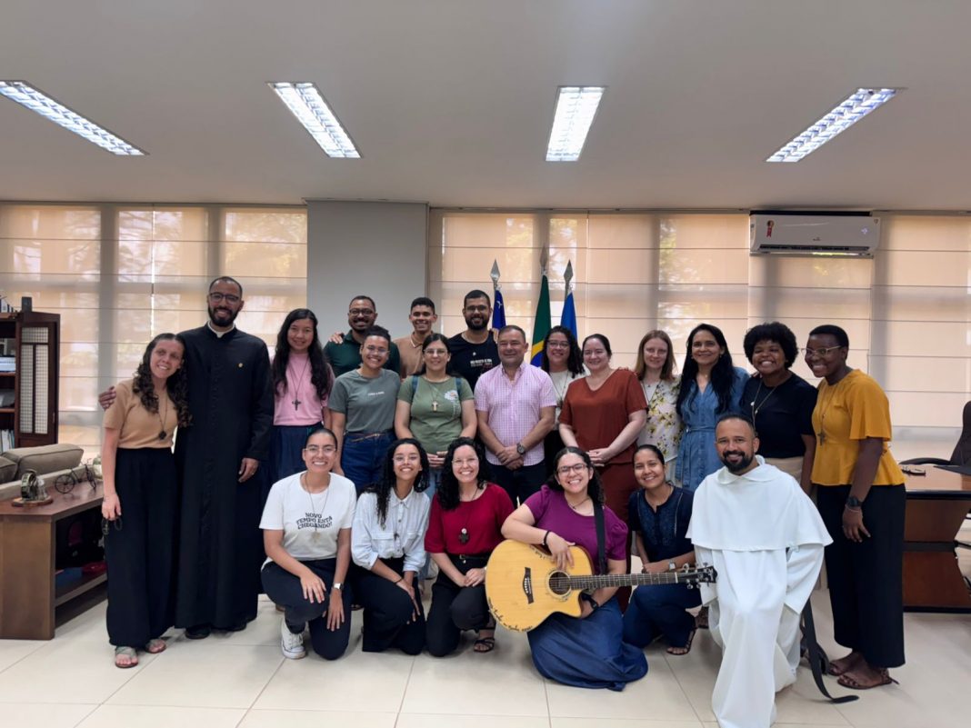 O prefeito Geneilton recebeu o grupo em seu gabinete, ao lado da vice-prefeita Flaviane Scopel, para um momento de oração e diálogo. O encontro foi marcado por gestos de fé, partilha e gratidão, reforçando a importância da missão que eles desenvolvem e da escolha de vida dedicada ao amor ao próximo e ao serviço a Deus.