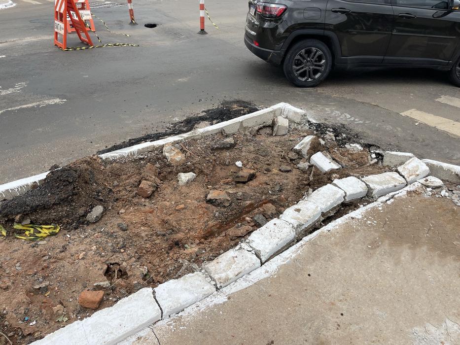 Equipe da Seinfra executa trabalho de recuperação da vala, reconstrução de um poço de visita e da ilha na esquina com a Rua 132