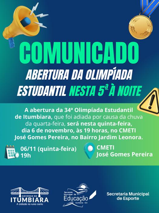 A abertura da 34ª Olimpíada Estudantil de Itumbiara, adiada por causa da chuva, será nesta quinta-feira (06/11), às 19h, no CMETI José Gomes Pereira, no Bairro Jardim Leonora.