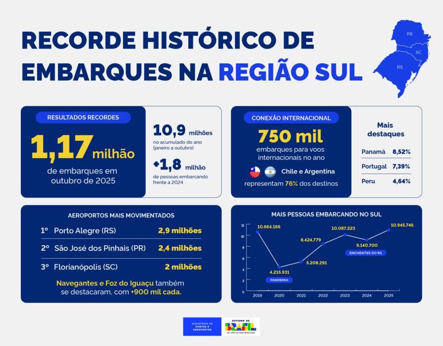 A quebra de recordes não se restringiu apenas ao mês de outubro. A procura por viagens aéreas com origem na região tem-se mostrado consistente ao longo de todo o ano. No acumulado de janeiro a outubro de 2025, 10.945.746 passageiros decolaram de aeroportos do Sul. Esse montante supera o antigo recorde, de 2019 (10,6 milhões), e representa um salto expressivo na comparação com o mesmo período do ano passado, quando foram registrados 9,1 milhões de passageiros.
