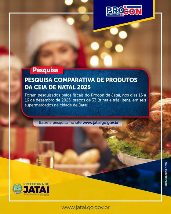 O Procon Municipal de Jataí divulgou, nesta sexta-feira (19/12), um levantamento detalhado de preços dos itens que compõem a tradicional Ceia de Natal. A equipe visitou seis grandes estabelecimentos comerciais da cidade entre os dias 15 e 16 de dezembro, monitorando 33 produtos de alto consumo nesta época, como carnes, frutas, vinhos, panetones e doces. O objetivo central da iniciativa é oferecer uma referência ao cidadão, auxiliando na busca pelo menor preço e incentivando a economia doméstica.
