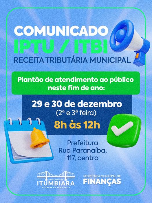 A Prefeitura de Itumbiara informa que os setores de IPTU e ITBI estarão em plantão de atendimento ao público nos dias 29 e 30 de dezembro (segunda e terça-feira), das 8h às 12h.