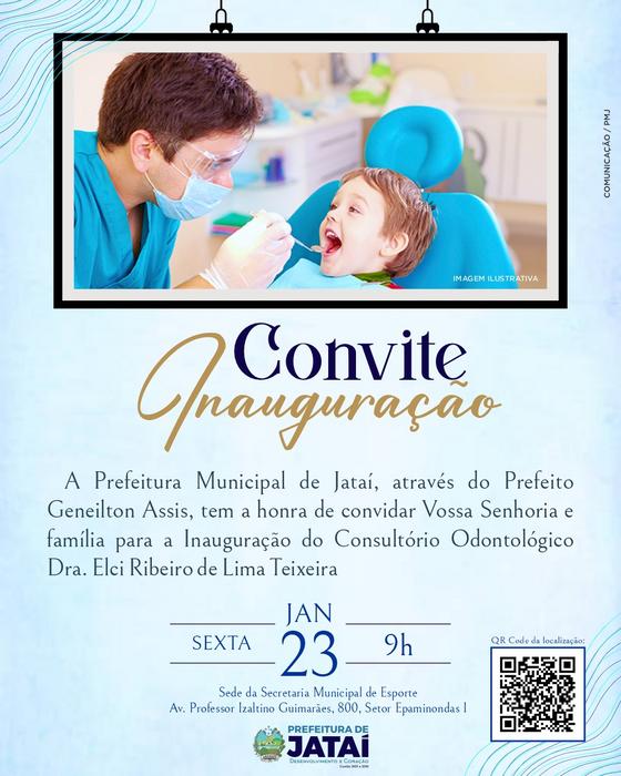O Prefeito de Jataí, Geneilton Assis, tem a honra de convidar toda a população e autoridades locais para a cerimônia de inauguração do Consultório Odontológico Dra. Elci Ribeiro de Lima Teixeira.