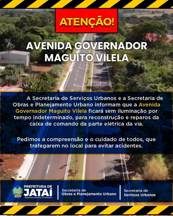 A Prefeitura de Jataí, por meio das Secretarias Municipais de Serviços Urbanos e de Obras e Planejamento Urbano, informa que a Avenida Governador Maguito Vilela (antiga Alameda das Primaveras) ficará sem iluminação por tempo indeterminado.