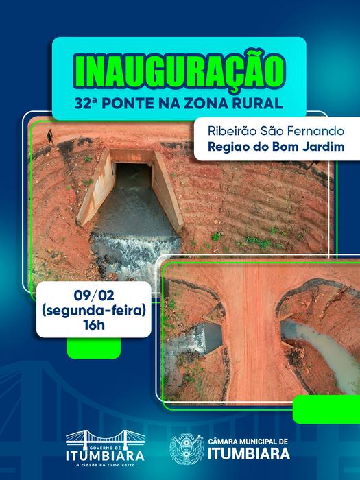 A Prefeitura de Itumbiara convida toda a população para a inauguração da 32ª ponte na zona rural, um importante avanço para garantir mais segurança, mobilidade e desenvolvimento para quem vive e produz no campo.