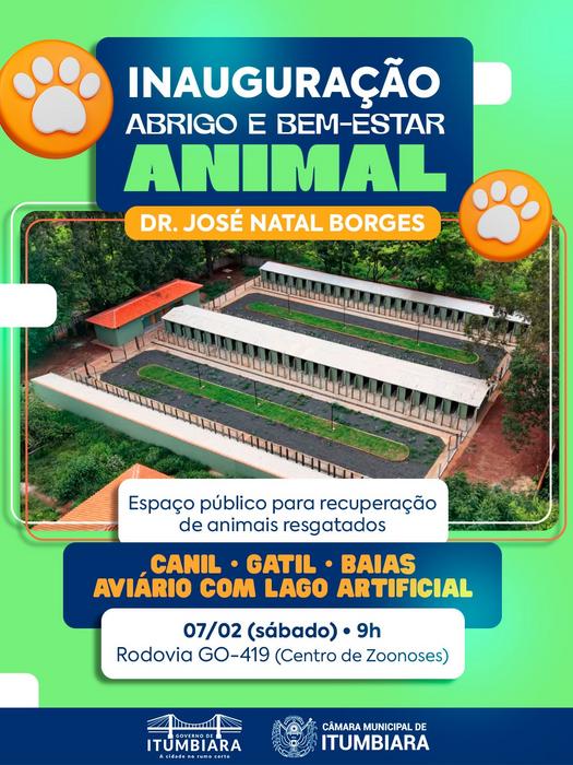 A Prefeitura de Itumbiara convida toda a população para a inauguração do Abrigo Bem-Estar Animal, um espaço público pensado para acolher, tratar e oferecer dignidade aos animais resgatados, com estrutura moderna contando com canil, gatil, baias e aviário com lago artificial.