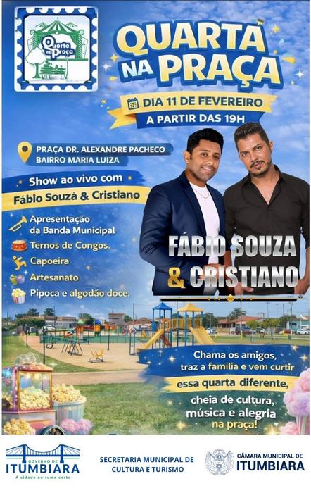 Nesta quarta-feira, 11 de fevereiro, a partir das 19h, a população está convidada para aproveitar mais uma edição do Quarta na Praça, na Praça Dr. Alexandre Pacheco, no bairro Maria Luiza.