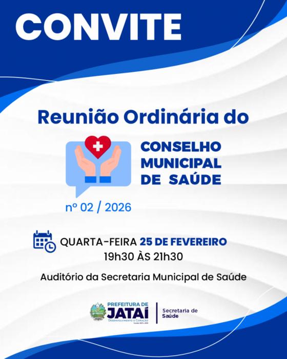 O Conselho Municipal de Saúde de Jataí realizará a 2ª Reunião Ordinária nº 02/2026 no dia 25 de fevereiro de 2026 (quarta-feira), das 19h30 às 21h30, no auditório da Secretaria Municipal de Saúde.