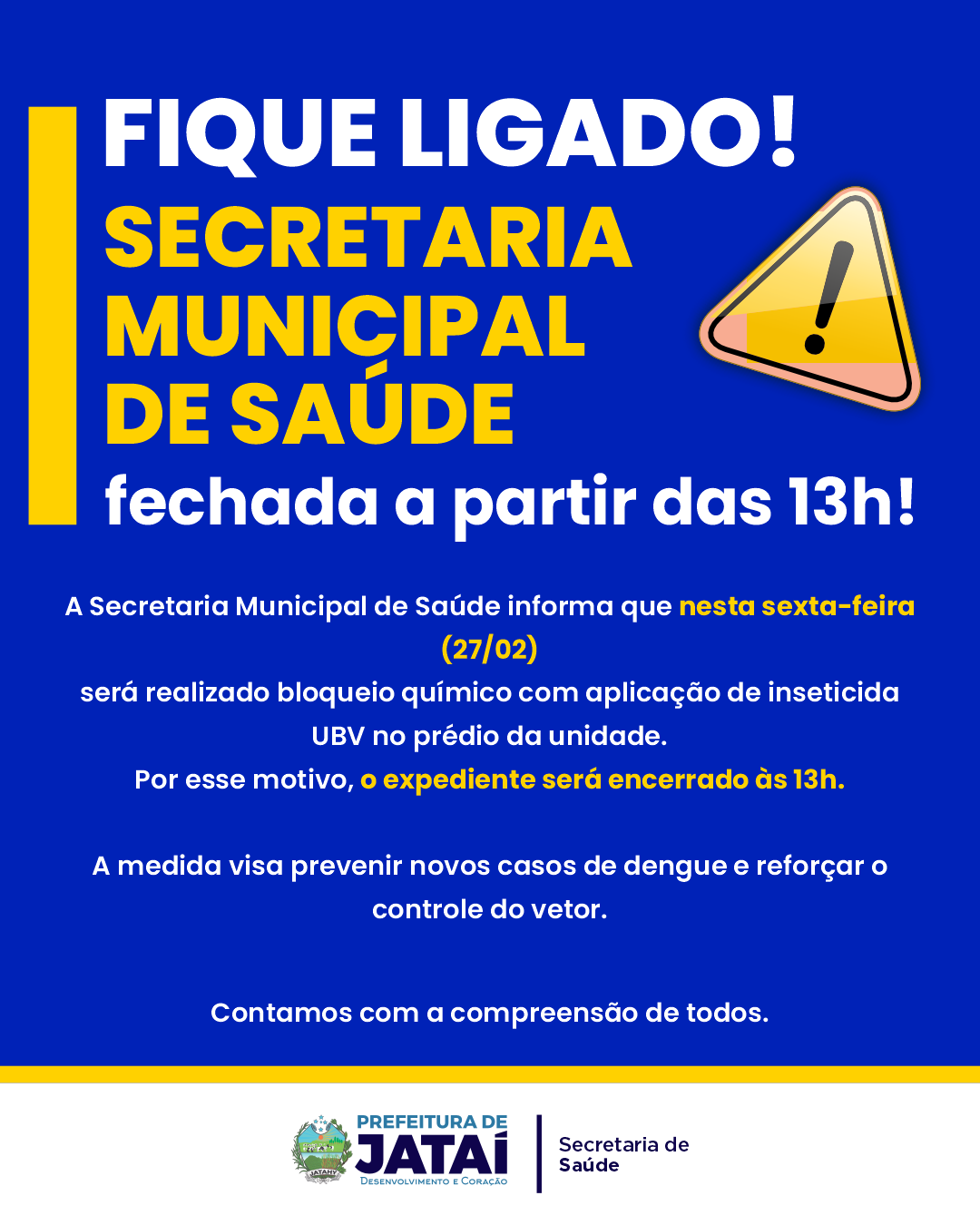 A Prefeitura de Jataí informa que a Secretaria Municipal de Saúde realizará, nesta sexta-feira (27/02), bloqueio químico com aplicação de inseticida a Ultrabaixo Volume (UBV) nas dependências do prédio administrativo.