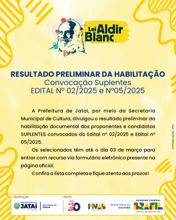 A Prefeitura de Jataí, por meio da Secretaria Municipal de Cultura, divulgou o resultado preliminar da habilitação documental dos proponentes e candidatos suplentes convocados pelos Editais nº 02/2025 e nº 05/2025 da Lei Aldir Blanc.