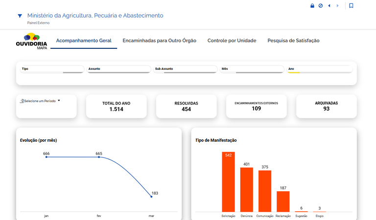 O Ministério da Agricultura e Pecuária (Mapa) lançou o novo Painel da Ouvidoria “Agro O UV”. A iniciativa tem como objetivo oferecer ao cidadão uma visão clara e atualizada de como as manifestações são recebidas e processadas pelo órgão. No painel, é possível acompanhar o número de comunicações registradas, incluindo denúncias, reclamações, elogios e sugestões, garantindo mais transparência sobre o funcionamento do serviço.