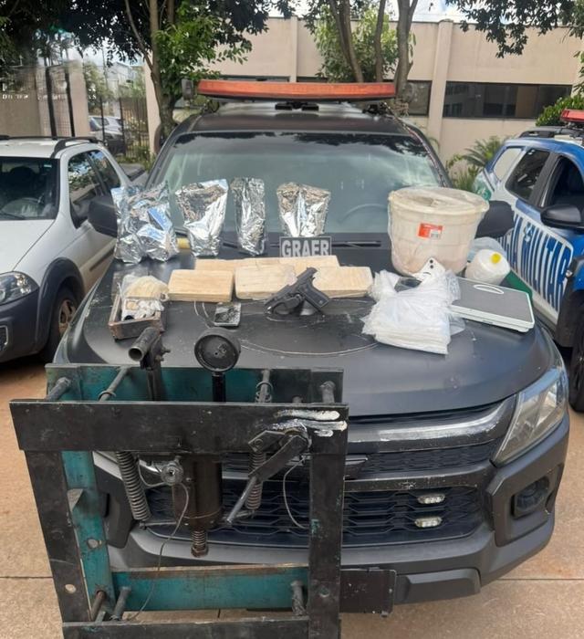 No local, os policiais apreenderam ainda: uma prensa hidráulica, balança de precisão e uma grande quantidade de insumos químicos utilizados para o preparo da droga. Além das substâncias ilícitas, a PMGO retirou de circulação uma pistola Taurus calibre .380 e apreendeu dois veículos que eram utilizados para a distribuição dos entorpecentes na região metropolitana.