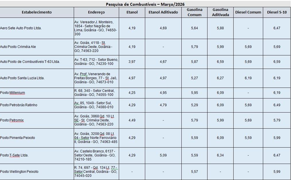 O Procon Goiânia divulga resultados de uma pesquisa comparativa de preços de combustíveis realizada entre os dias 6 e 10 de março em 10 postos do município. O levantamento analisou os valores praticados para etanol hidratado, etanol aditivado, gasolina comum, gasolina aditivada, diesel comum e diesel aditivado.