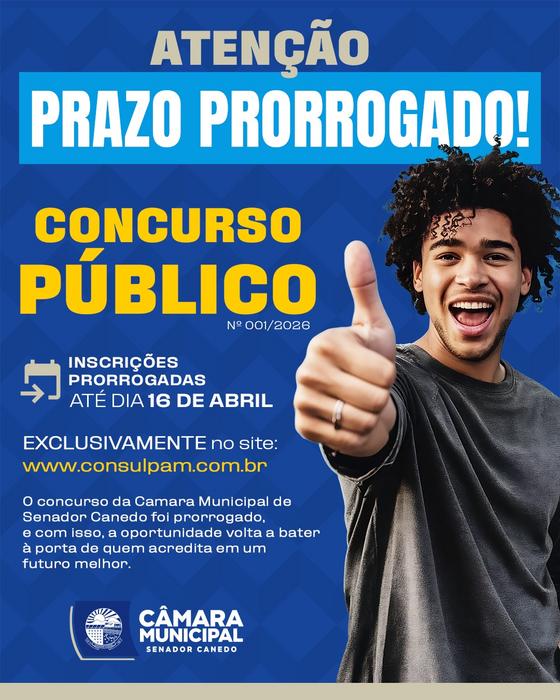 O concurso público da Câmara Municipal de Senador Canedo foi prorrogado, e com isso, um novo caminho se abre para quem acredita no poder da dedicação e da conquista. São 25 vagas e as inscrições seguem abertas até o dia 16/04/2026.