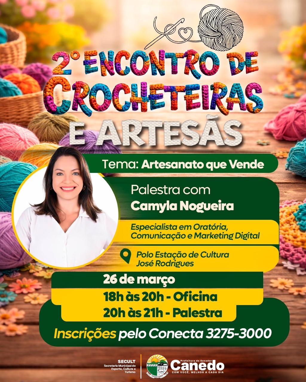 Às 20h, teremos uma palestra especial com Camyla Nogueira, especialista em Oratória, Comunicação e Marketing Digital, que irá compartilhar dicas práticas sobre como usar as redes sociais para divulgar, posicionar e vender seu artesanato. A palestra terá duração das 20h às 21h.