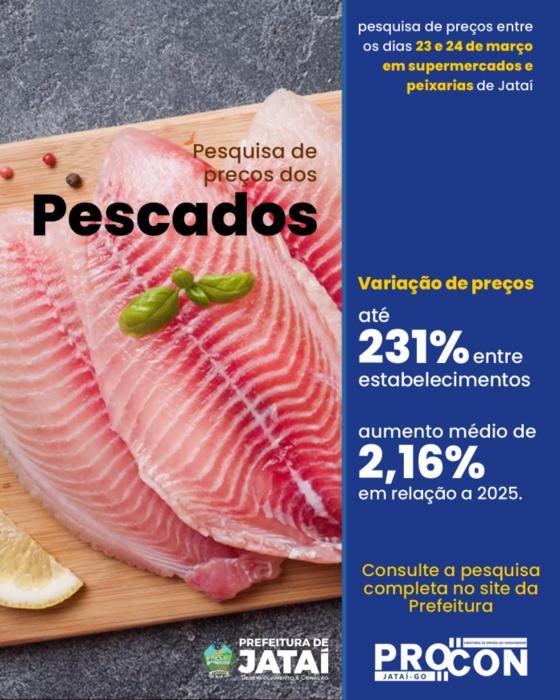 A Prefeitura de Jataí, por meio do Procon Municipal, divulgou a mais recente pesquisa de preços de pescados, realizada nos dias 23 e 24 de março de 2026 em supermercados e peixarias do município.