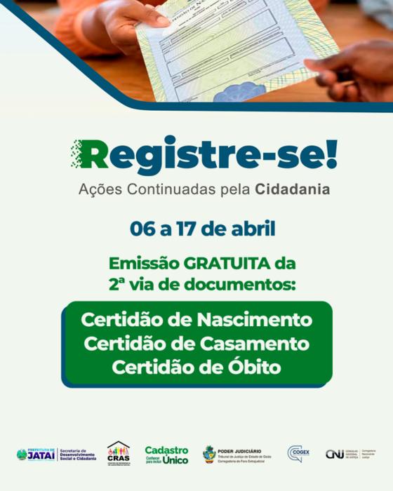 A Prefeitura de Jataí, por meio da Secretaria de Desenvolvimento Social e Cidadania, em parceria com o Poder Judiciário, COGEXe o Conselho Nacional de Justiça (CNJ), realizará a ação Registre-se, iniciativa que garante à população o acesso gratuito à documentação civil básica.