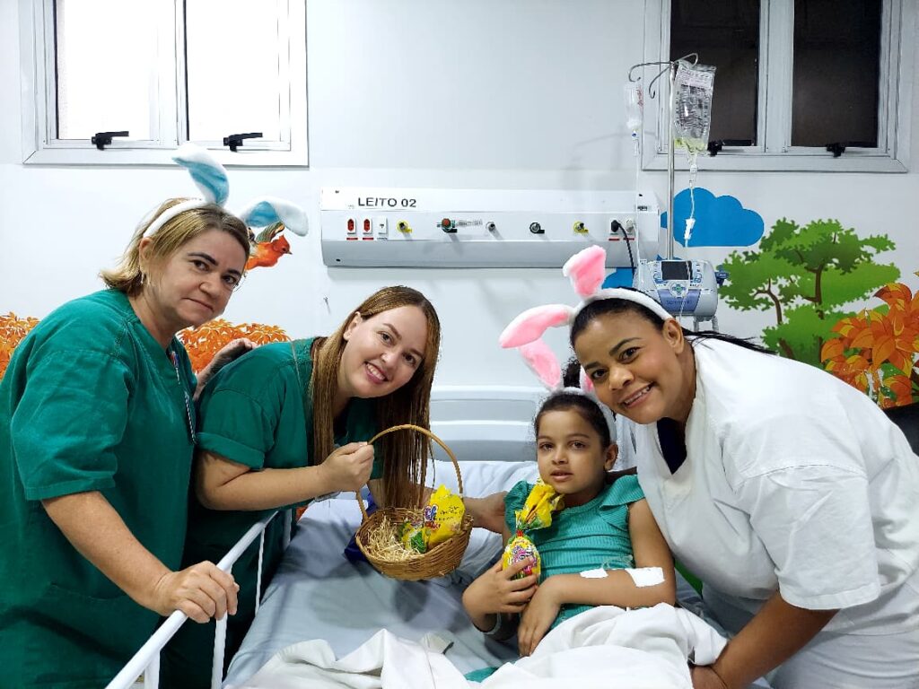 Na ala de pediatria, a programação de Páscoa também mobilizou pacientes e familiares em um momento de acolhimento e descontração. Profissionais caracterizados com orelhinhas de coelho realizaram a entrega de ovos de chocolate às crianças internadas, promovendo um ambiente mais leve e contribuindo para o bem-estar emocional durante o período de hospitalização.