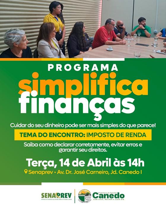 Com foco na proteção e no bem-estar dos aposentados, o Senaprev de Senador Canedo realiza, nesta terça-feira, às 14h, mais uma edição do Projeto Simplifica Finanças, na sede do órgão. A iniciativa é voltada exclusivamente para aposentados e tem como principal objetivo orientar esse público sobre como administrar melhor seus recursos e evitar fraudes financeiras.