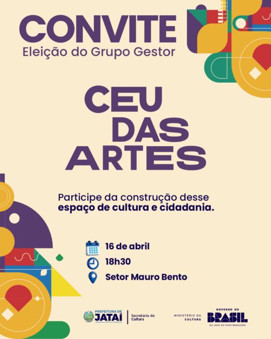 A Prefeitura de Jataí, por meio da Secretaria Municipal de Cultura, convida toda a população, em especial a do entorno da Praça CEU das Artes, no Setor Mauro Bento, para acompanhar a eleição dos membros que formarão a nova composição do grupo gestor desse importante espaço de cultura, esporte e desenvolvimento social. Essa eleição ocorrerá no próximo dia 16 de abril (quinta feira), às 18h30, na primeira convocação.