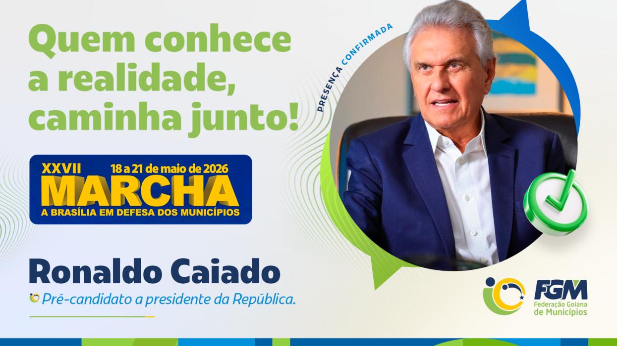 O pré-candidato à Presidência da República Ronaldo Caiado (PSD) confirmou nesta terça-feira, 14 de abril, presença na XXVII Marcha a Brasília em Defesa dos Municípios, que será realizada entre os dias 18 e 21 de maio, na capital federal.