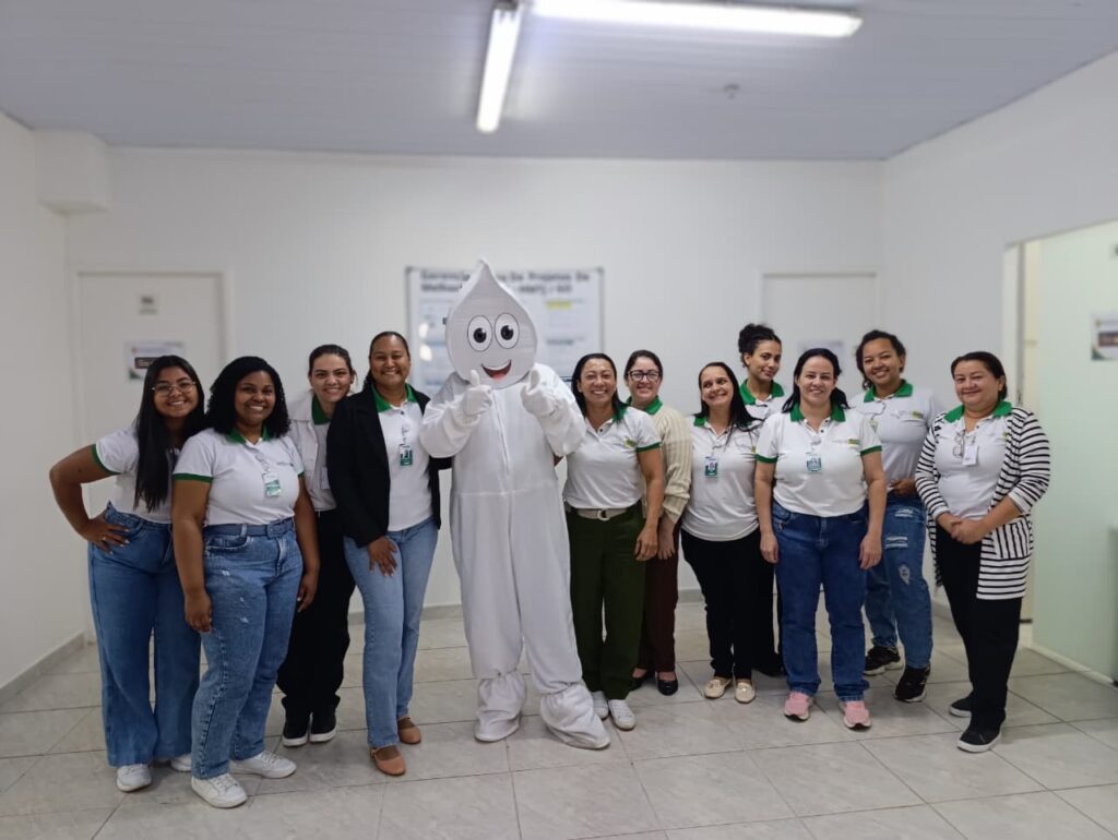 Colaboradoras do Heapa e o Zé Gotinha da unidade durante a campanha de imunização