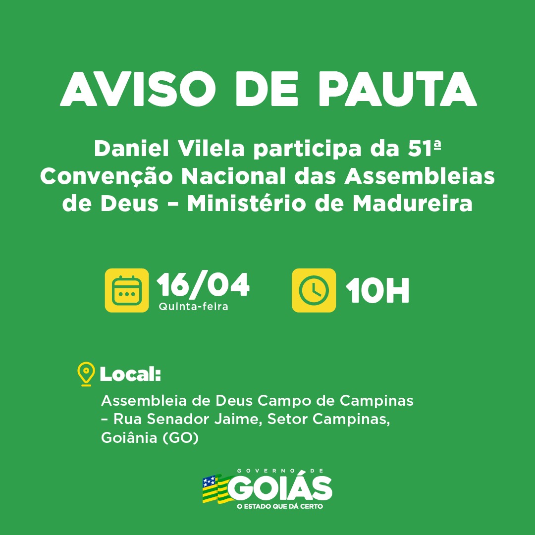 Agenda do governador – Daniel Vilela e a primeira-dama Iara Vilela participam nesta quinta-feira (16/04), às 10 horas, da 51ª edição da Convenção Nacional das Assembleias de Deus – Ministério de Madureira (Conamad), na sede do Campo de Campinas, em Goiânia.