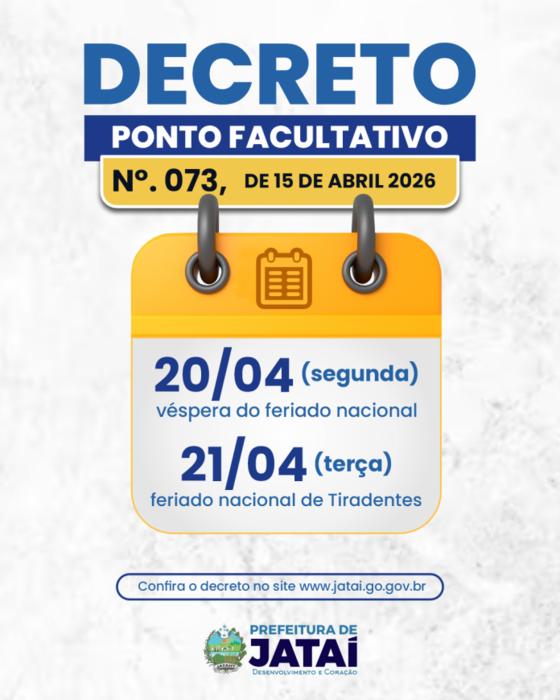A Prefeitura de Jataí informa que foi publicado o Decreto nº 073/2026, que estabelece ponto facultativo no dia 20 de abril (segunda-feira), véspera do feriado nacional de Tiradentes.