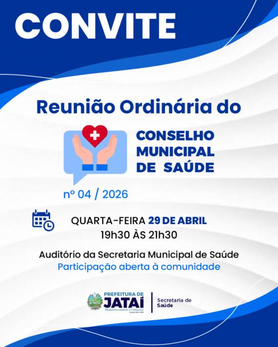 O Conselho Municipal de Saúde de Jataí realiza, no dia 29 de abril de 2026, a 4ª Reunião Ordinária, com início às 19h30, no auditório da Secretaria Municipal de Saúde.